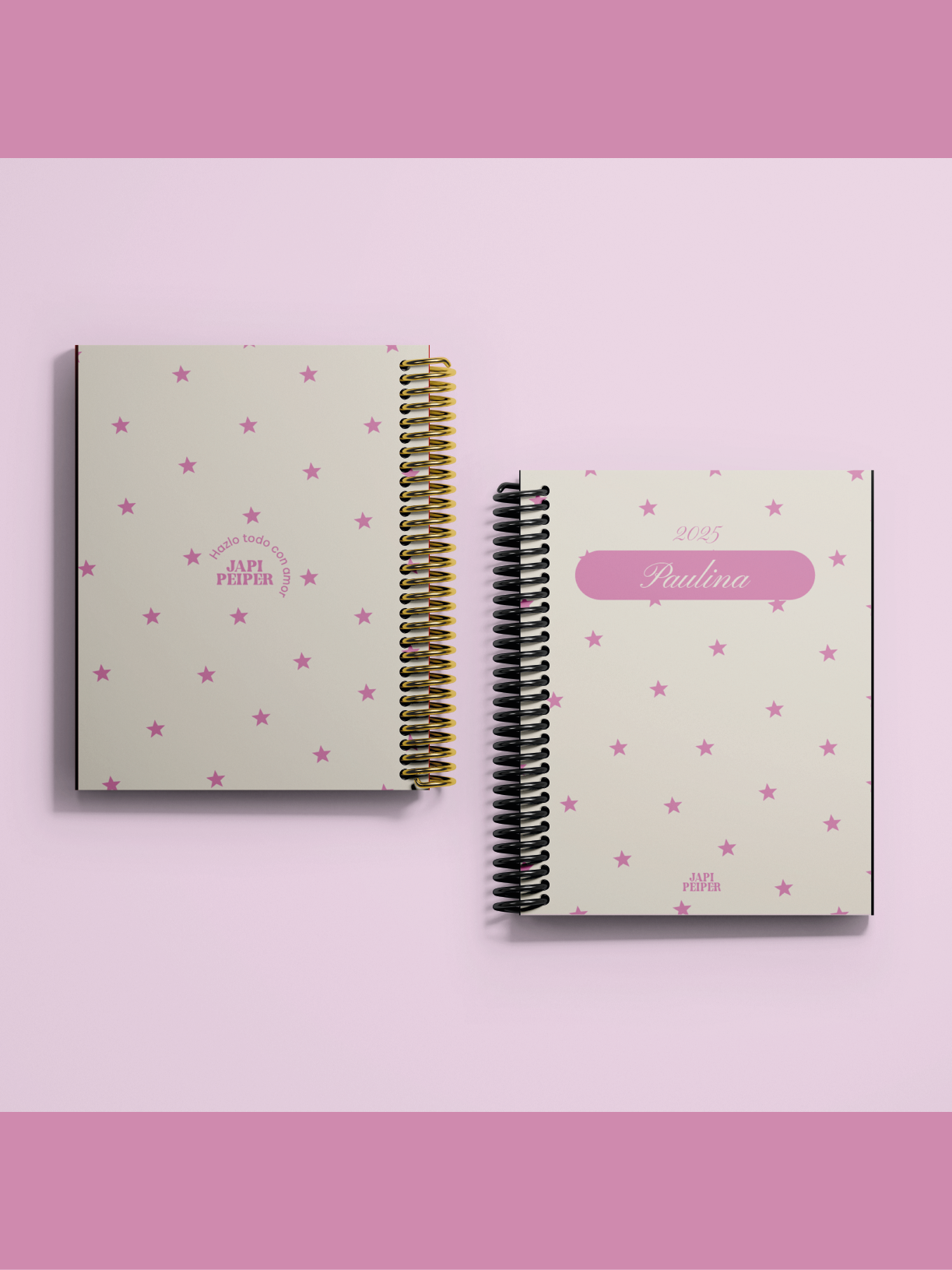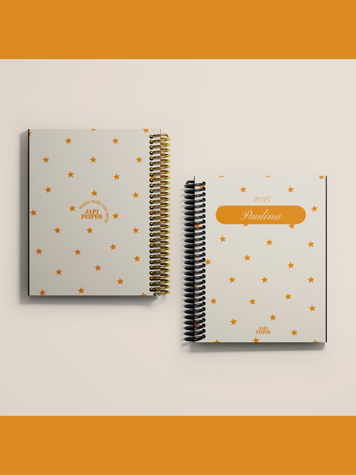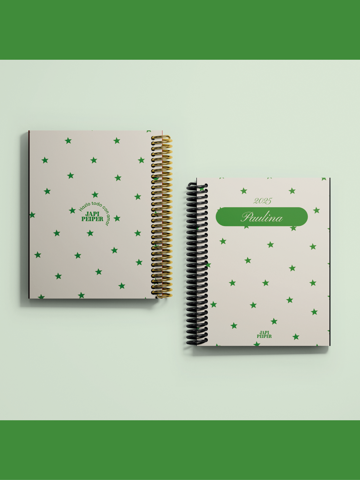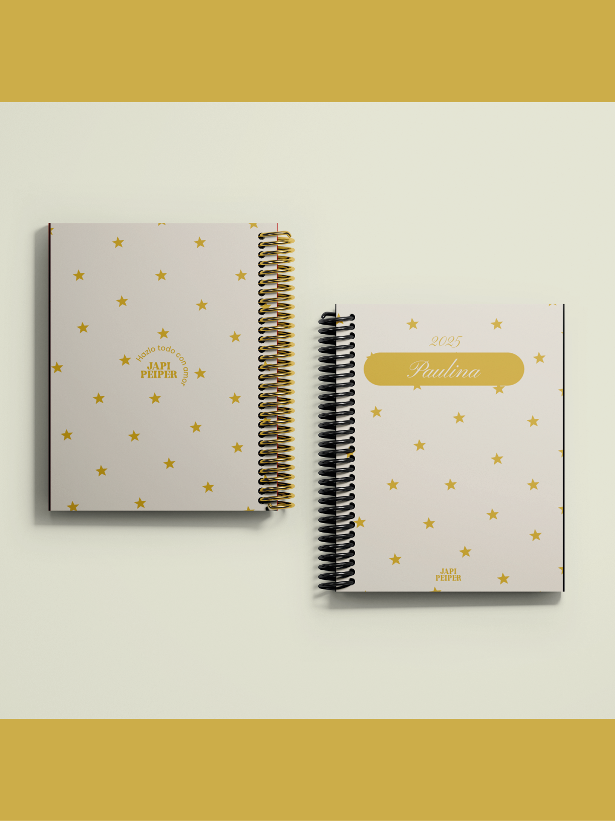 La portada es personalizada, decide que colores de nuestras opciones te gustaría, si quieres que tenga tu nombre, nombre y apellido, que no diga nada o una frase a tu gusto.